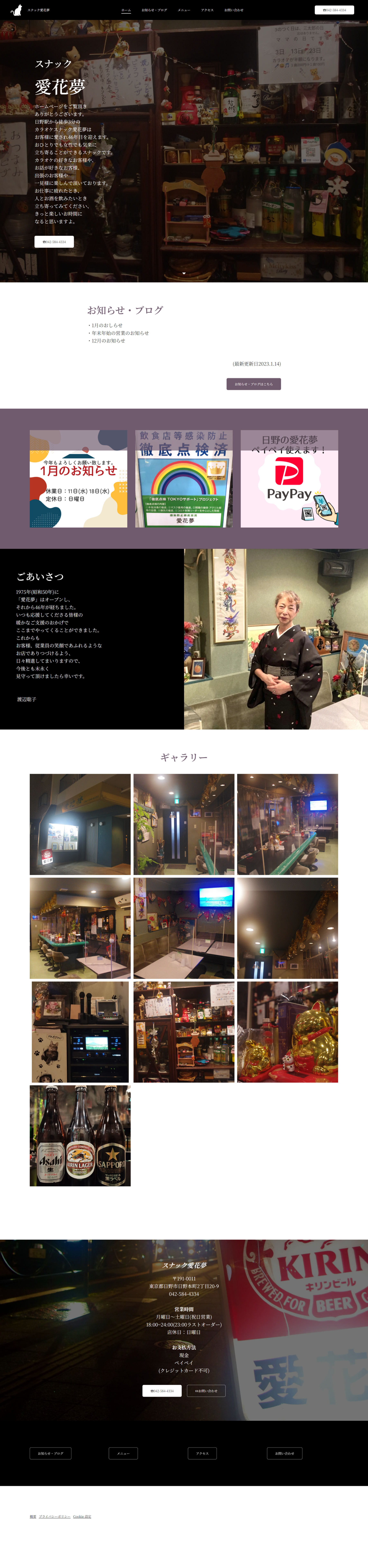 | 概要 | 維持費を抑えて、スピーディーにHPを作成できるのがJimdoの特徴です。お店のママにヒヤリングをして、構成、写真撮影から運用までサポートさせていただきました。デザインは、しっとりとした色合いでかつ楽ししさが伝わるような雰囲気になっています。 https://aikamu.jimdosite.com/ |