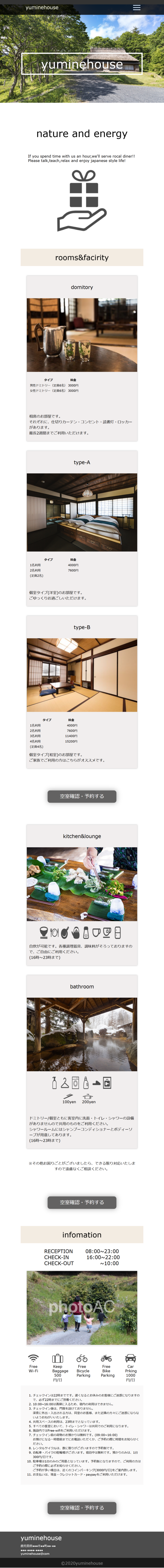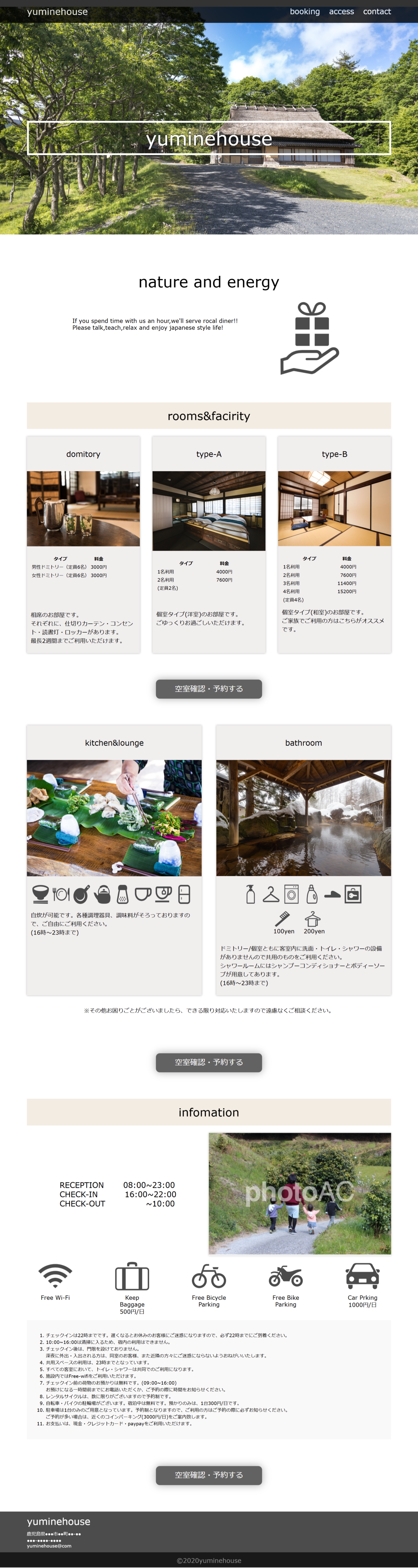 概要田舎を感じられゆったりとした時間を感じられるゲストハウスのHPを作成しました。日本語、英語どちらの言語でも理解できるように、文字とアイコン写真を組みあわせています。田舎を感じられゆったりとした時間を感じられるゲストハウスのHPを作成しました。日本語、英語どちらの言語でも理解できるように、文字とアイコン写真を組みあわせています。