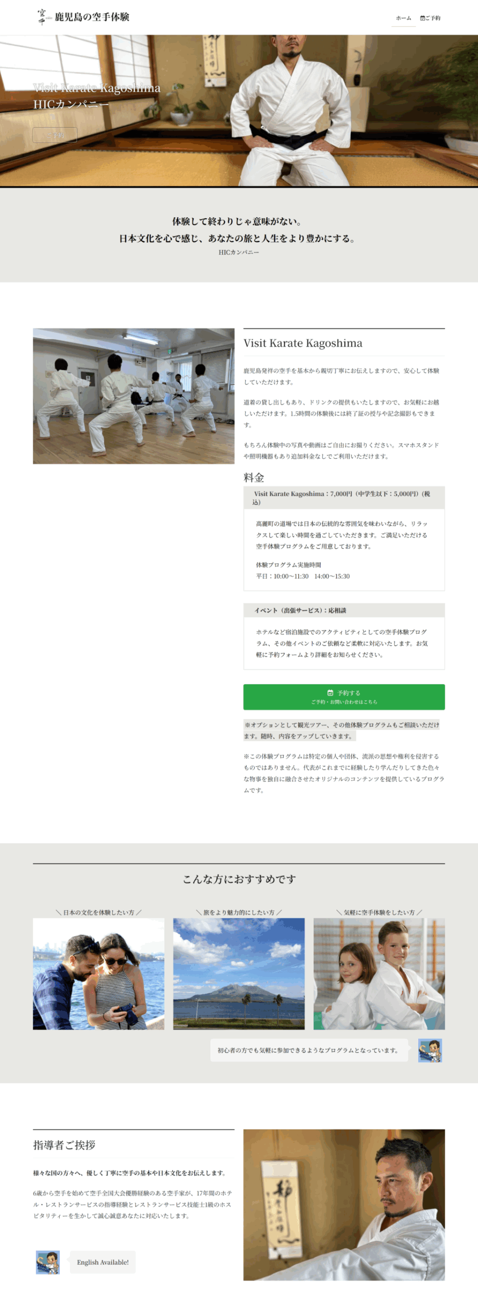 | 概要 | 鹿児島で空手体験を提供する「Visit Karate Kagoshima HICカンパニー」様の新規サイト立ち上げを担当いたしました。 旅行中に日本文化に触れられる体験型プログラムを通じて、日本、鹿児島の魅力をより深く感じていただける内容となっています。空手の際に見せる凛としたまなざしと、日常では親しみやすく温かみのある代表の人柄も、訪れる方々の印象に残る魅力のひとつです。 サイト制作では、空手の力強さや緊張感を表現しつつ、初心者でも気軽に参加できるプログラムの魅力が伝わるよう、構成とデザインに工夫を凝らしました。 https://hiccompany244.net/ |